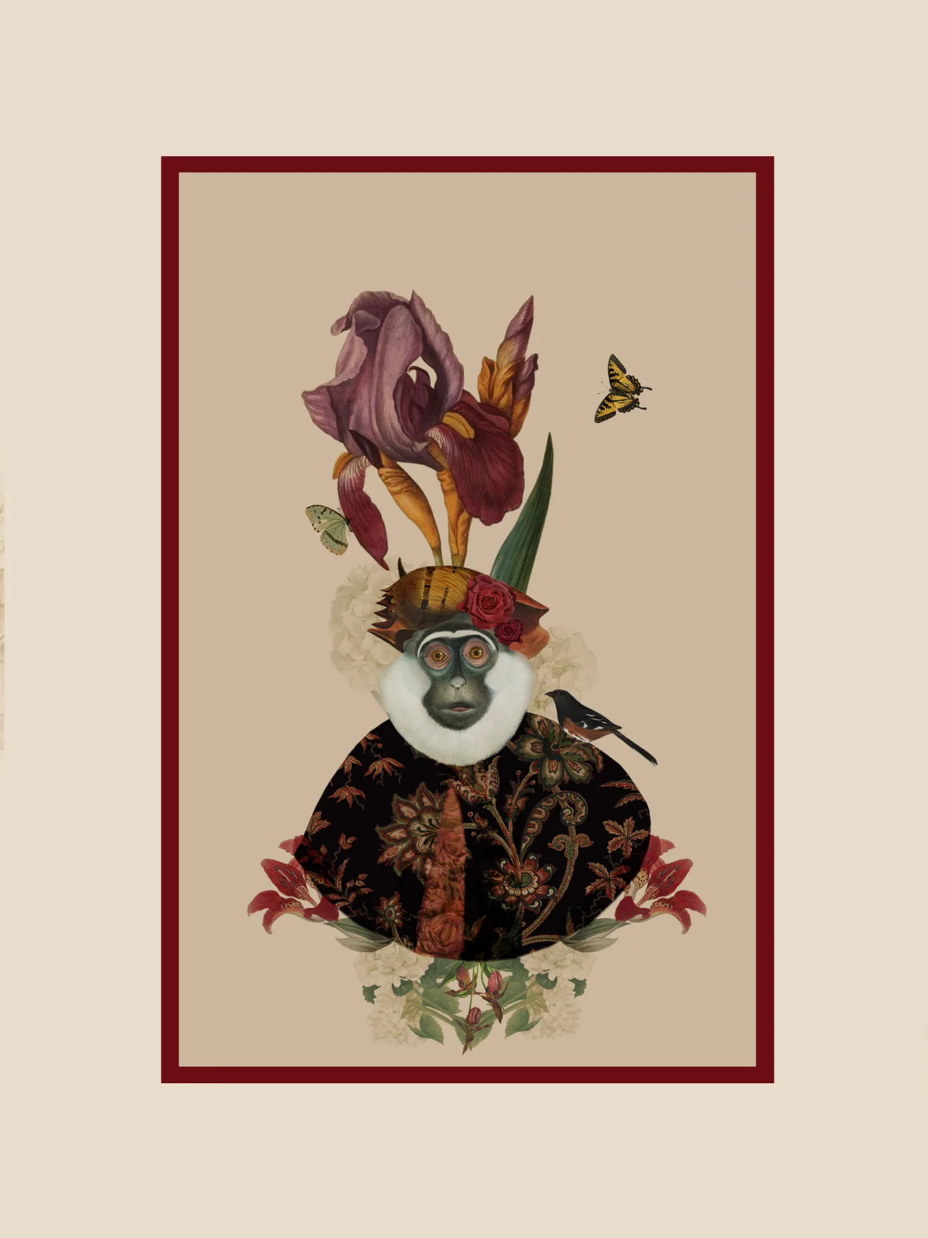 Created for the Life House Nantucket project, this artwork playfully turns the idea of a formal portrait on its head. A well-dressed primate, crowned with flowers and fluttering companions, takes center stage as an unlikely host—curious, mischievous, and entirely self-possessed. Part island folklore, part inside joke, the piece celebrates Nantucket’s natural beauty with a wink, inviting guests to slow down, look closer, and enjoy the unexpected.