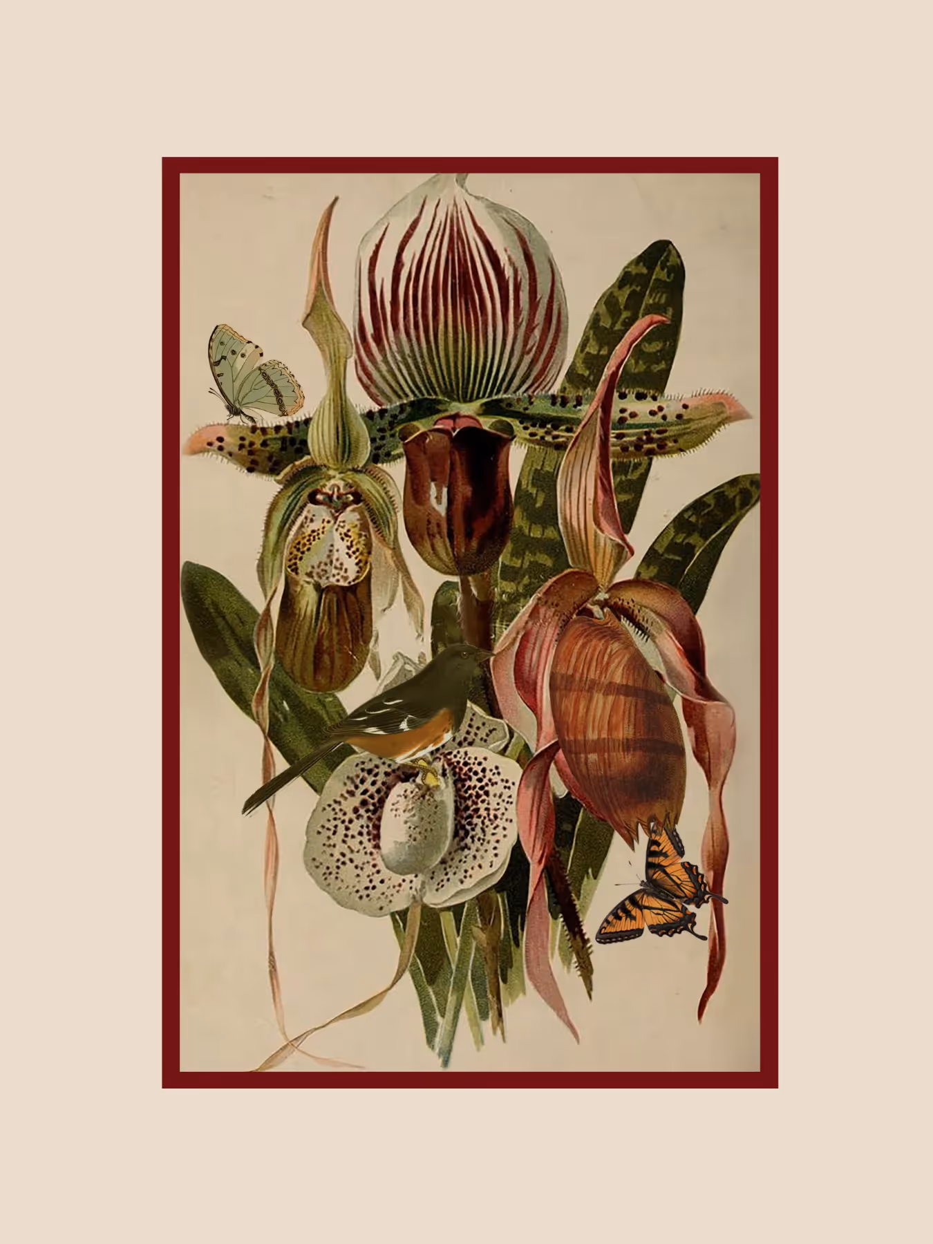 This piece brings together lush botanicals, butterflies, and a curious bird in a moment that feels both carefully composed and delightfully accidental. Part botanical study, part quiet fantasy, the work celebrates the beauty of overlap—where flora and fauna share the frame, pause together, and briefly steal the spotlight from one another. It invites the viewer to linger, noticing small gestures, hidden movement, and the joy of nature slightly out of order.