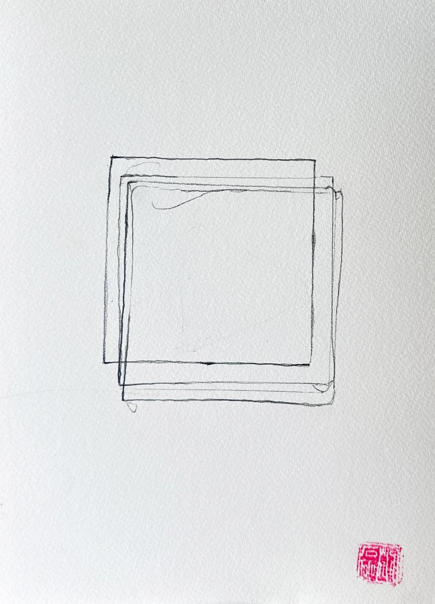 This drawing explores repetition, memory, and omission through simple geometric form. Three squares overlap and repeat, their edges traced with slight variation, suggesting both persistence and instability. A single triangle—implied rather than centered—functions as a quiet absence, something acknowledged only by its exclusion. The work reflects on how structure is formed not only by what is present, but by what is forgotten or left unresolved. Line weight and irregularity preserve the hand of the drawing, allowing imperfection to carry meaning.
