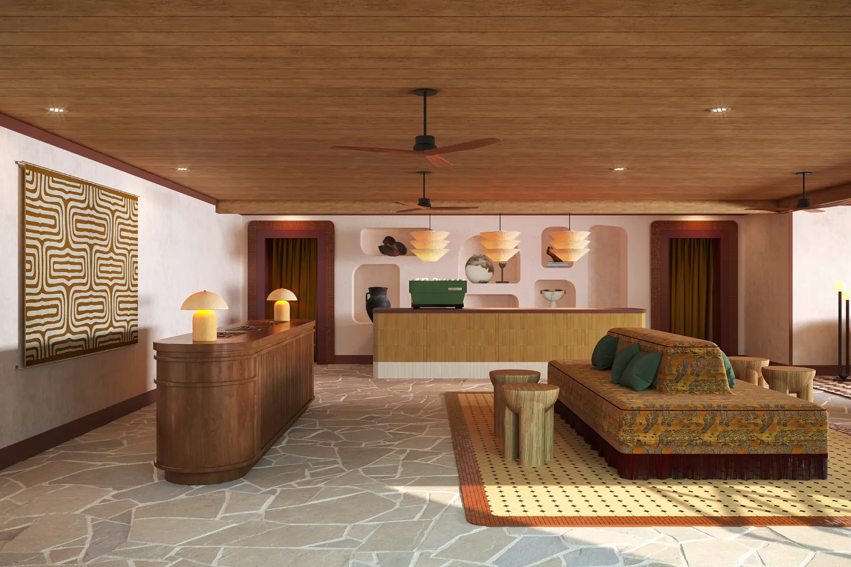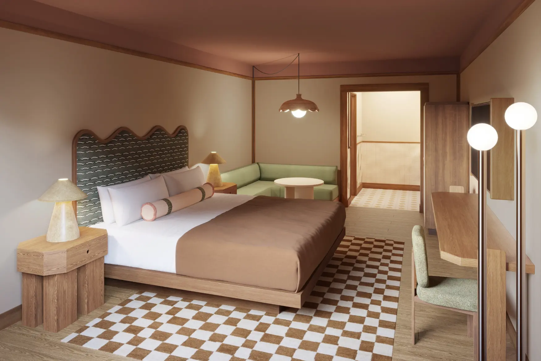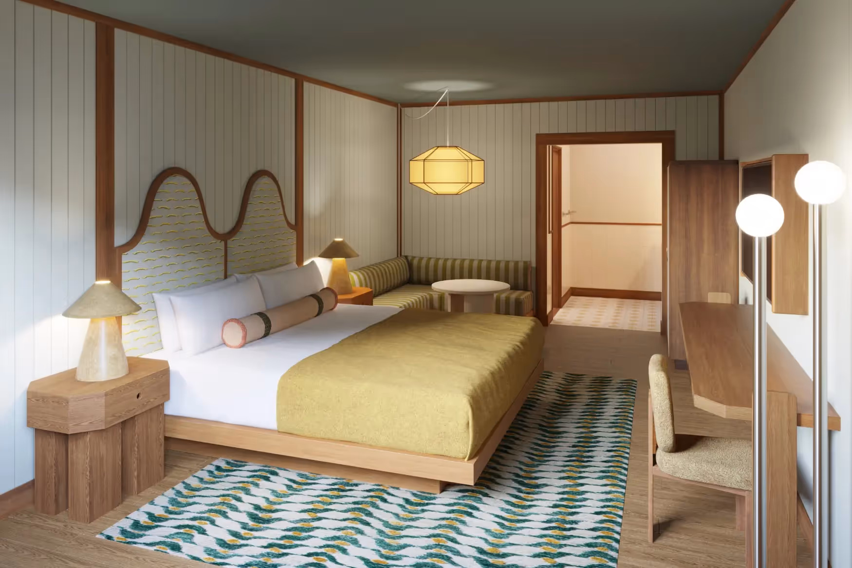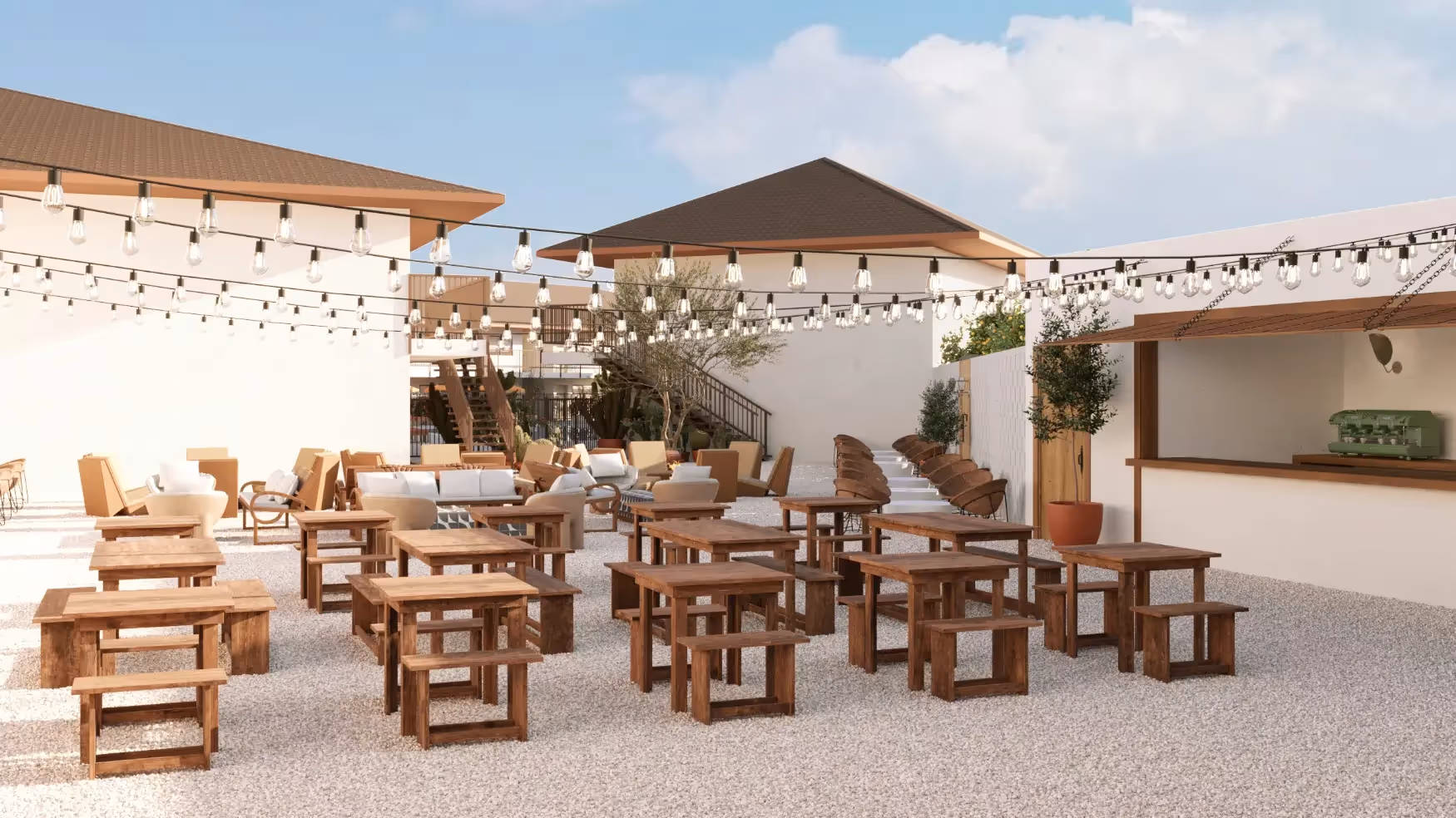 Casa La Roca is an 111-key motel transformation in Oakhurst, CA — one of the two primary gateway towns just fourteen miles from Yosemite National Park. Inspired by the architectural rhythm of traditional casita courtyards, the design nurtures a fluid connection between indoors and outdoors. Previously overlooked exterior areas were reimagined into an expansive social lounge anchored by a pop-up F&B window, encouraging casual gathering and movement throughout the property. The experience is easygoing and playful — positioned as a “world-away getaway” for Bay Area and Los Angeles travelers seeking adventure in Yosemite.