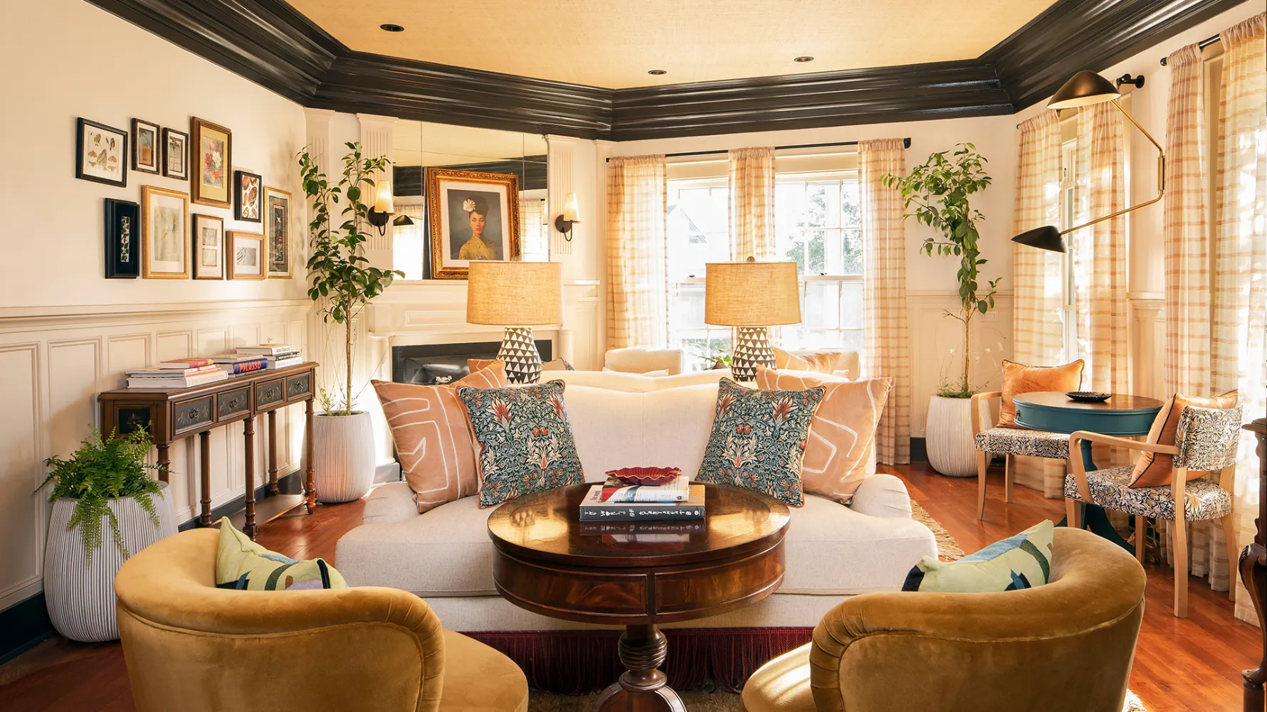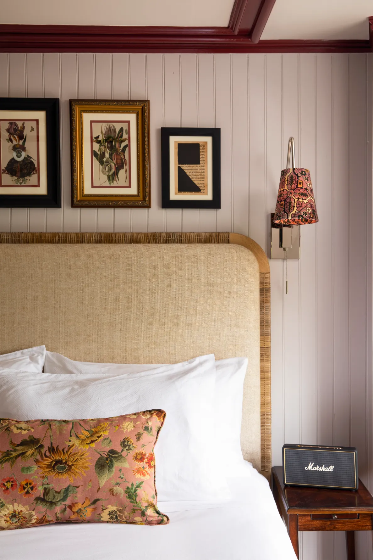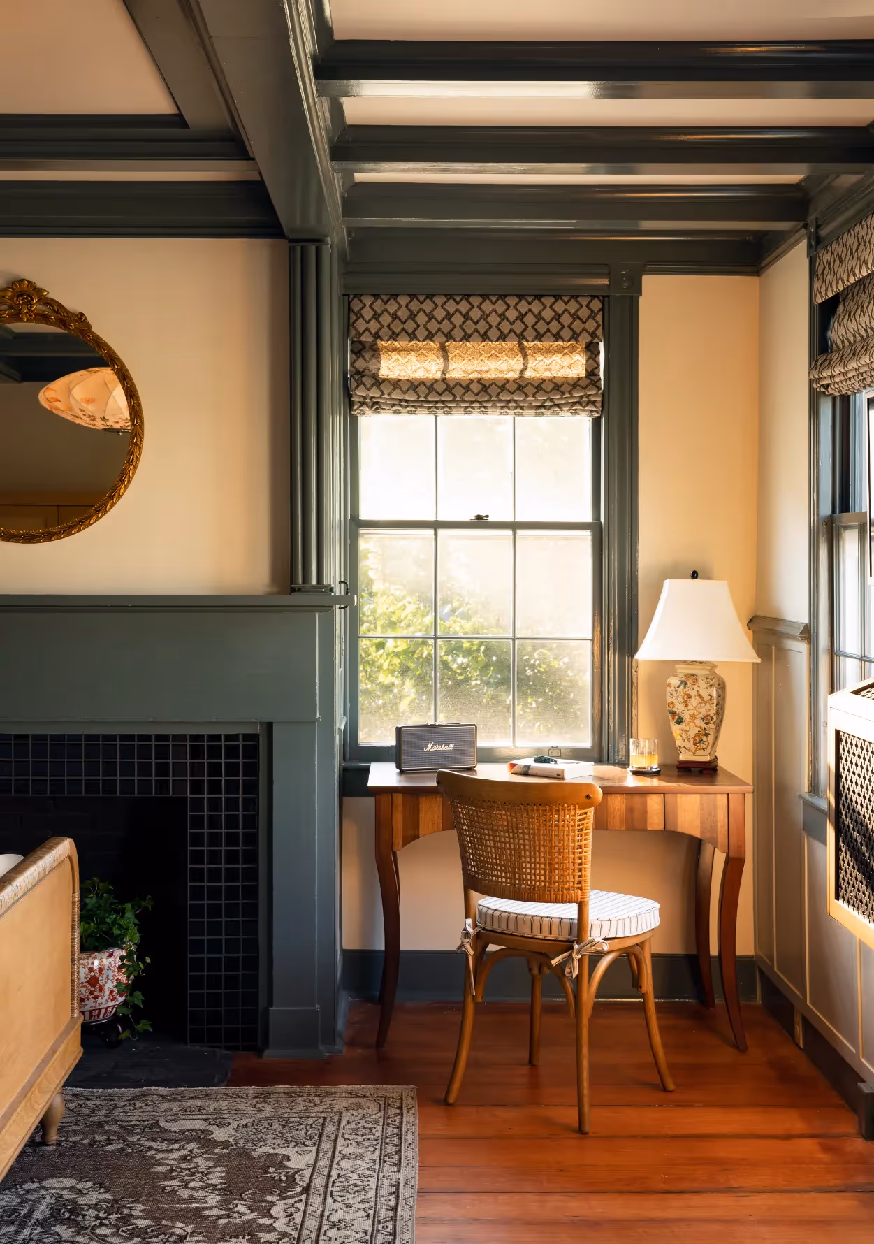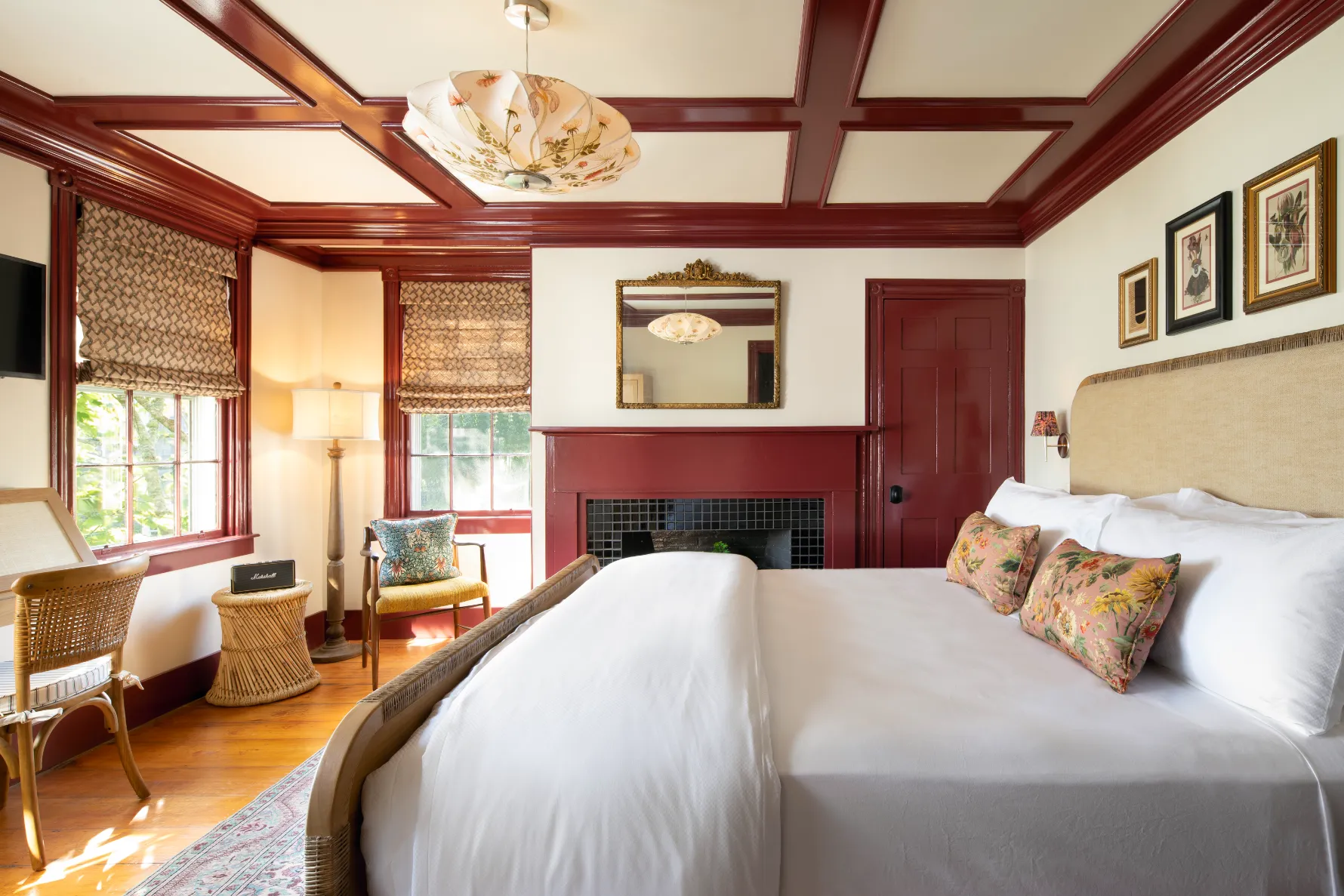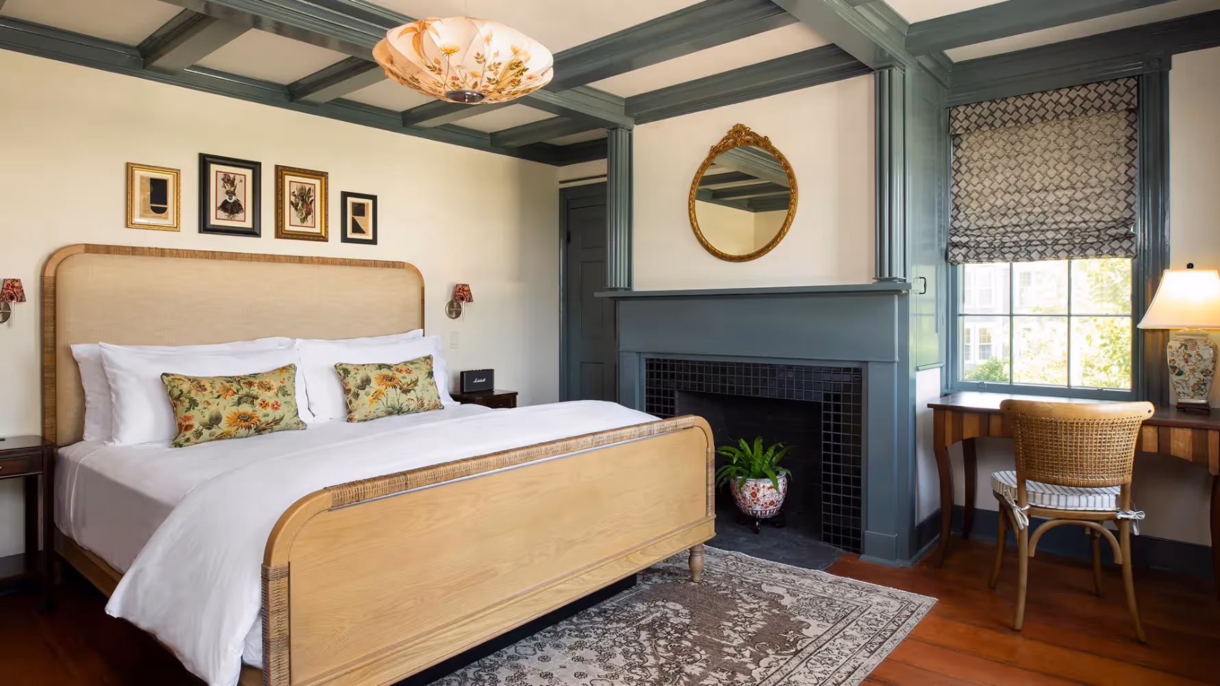 The refreshed design palette takes cues from the island’s native flora, including hydrangeas, daffodils, wild roses, and seagrass. Historic moldings are reimagined in modern tones, from deep Atlantic jade to soft blue, lilac, plum, and golden dandelion hues. Guests are welcomed by unique touches, such as a golden saber tiger runner, layered gallery walls, and framed Gucci scarves, evoking the innkeeper’s eclectic, global adventures. A bespoke key cabinet honors tradition with etched brass plaques naming each of the 14 guest rooms after local flowers, a thoughtful nod to the previous innkeeper’s legacy.