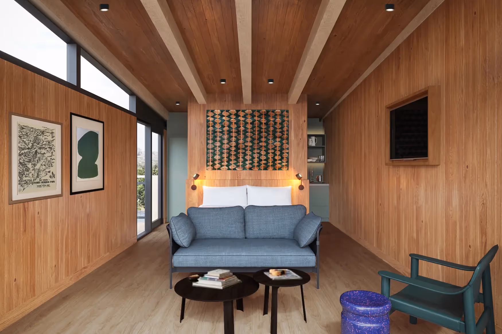 Debuting in Spring 2026, this new resort sits high on a hillside with sweeping views into Yosemite Valley. The property introduces 122 private cabins and 14 hotel keys, each oriented to nature and the topography. A vibrant clubhouse becomes the social heart of the destination—complete with a striking bar, casual dining, retail, a large pool deck, and conference spaces for up to 250 guests.